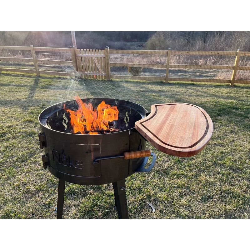 Featuring removable adjustable-height legs, the Malevo can be set up as a ground-level fire pit, or waist-height charcoal and wood grill. A hinged side door built into the heavy-duty steel body provides easy access to the nine-inch-deep coal bed for adding fuel or arranging coals to control the heat. The Malevo features a wooden side table that attaches to the grill, and a poker is included to adjust the coals.