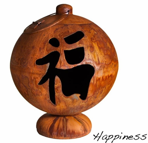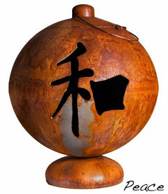 The “Peace, Happiness, Tranquility” Asian Inspired Fire Globe™ by Ohio Flame is a unique Fire Feature and artistic sculpture designed to bring the serenity of Asian design to your outdoor space. This elegant Fire Globe™ displays a triptych of Japanese kanji for “Peace“, “Happiness” and “Tranquility.” The design mimics the Japanese paper lantern and features a hinged access door with a handle. As part of the Skillman Signature Series, this creative Fire Feature is a creation of local artisan, Matt Skillman. He handcrafts each of these unique Fire Globes™, ensuring that they are built with quality and durability. With no parts to break or wear out over time, this Artisan Fire Globe™ is built to last a lifetime. “Peace, Happiness, Tranquility” is crafted from thick carbon American steel that is sourced from local steel mills. No maintenance is required for this Fire Bowl, as it’s designed to withstand the elements year-round. “Peace, Happiness, Tranquility” features a substantial Rain Drain to allow for water drainage. The “Patina Finish” features a natural iron oxide patina that will gradually darken over time. This Fire Globe™ is 100% American Made and is crafted by a local artisan. “Peace, Happiness, Tranquility” is backed by Ohio Flame’s Lifetime Warranty, guaranteeing that the Fire Globe™ will last a lifetime.