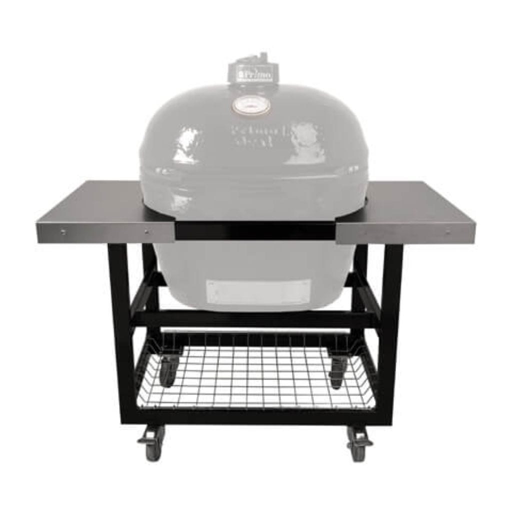 The Cart with Stainless Steel Top, this sturdy metal cart with a lower basket sports a stainless-steel top. It is our most popular cart and offers durability, protection, and mobility. The cart has two locking casters in the front to keep your grill in place while cooking.