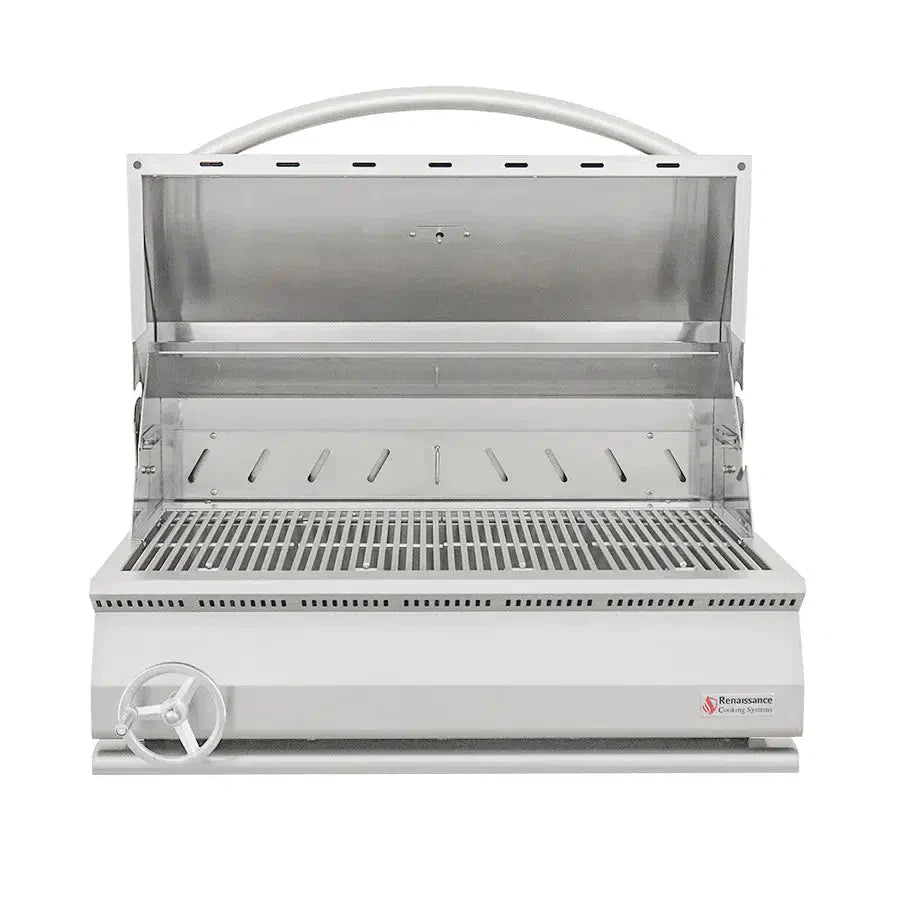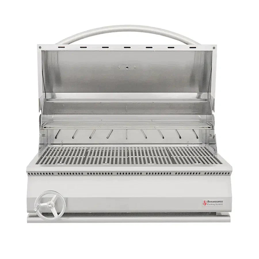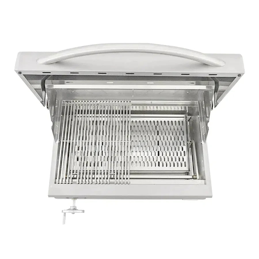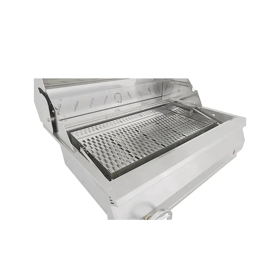 Exclusive vari–just charcoah tray, lid thermometer, upper rack, double lined hood, stainless cooking grates. lncludes crank wheel upgrade. Adjustable rear vent. Pull out ash tray. 720 Total Sq ln.
