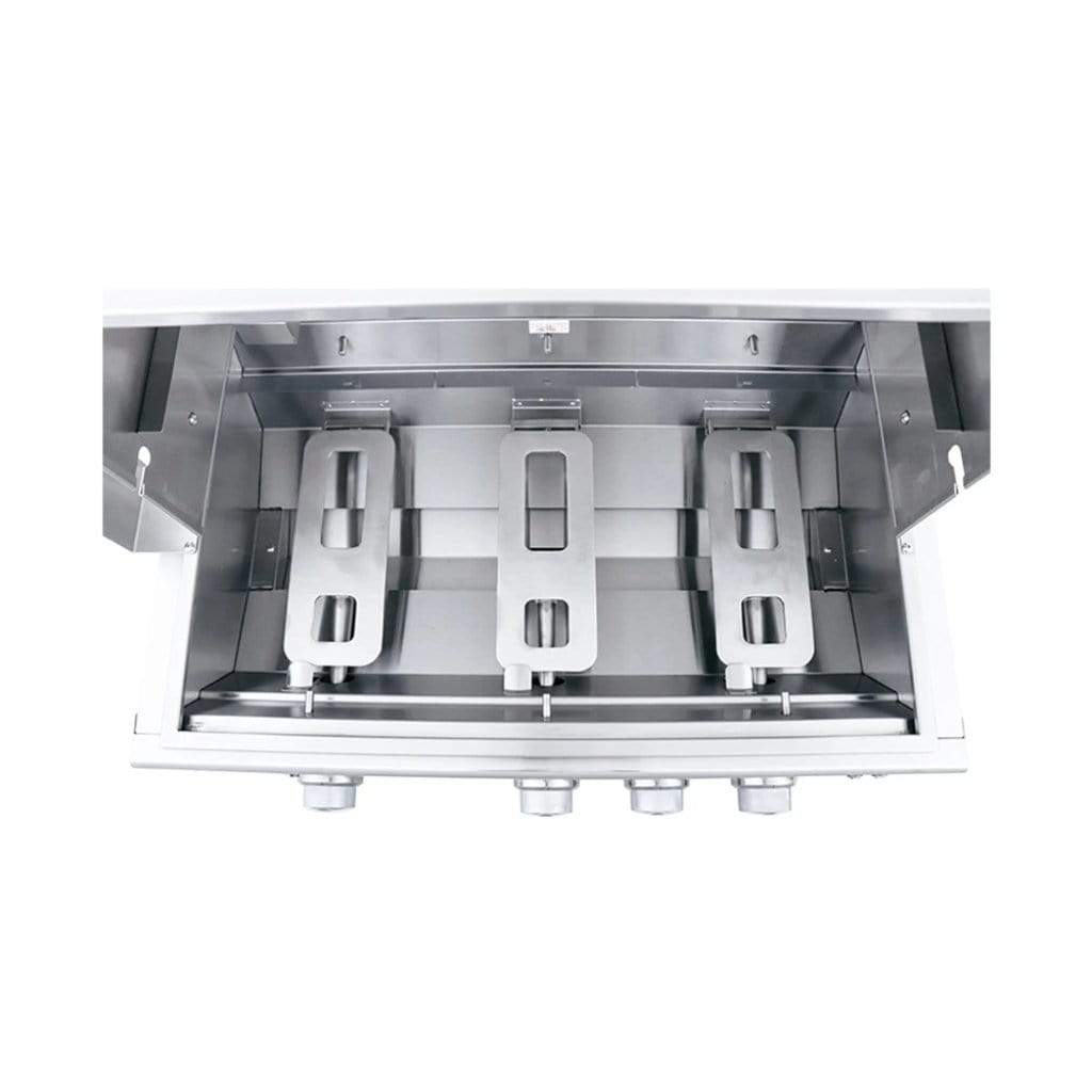 Cutlass Pro Series 2-Burner Slide-In Power Burner with LED LightsBring a little bit of your indoor kitchen outdoors. The RSB3A is constructed of 304 stainless steel construction for maximum strength and stability. This side burner features two Solid Brass burners for a total of 60,000 BTU’s, blue LED lights, and a removable wok-ring for cooking with round bottom pots, pans and woks perfect for sauces or dips. |
