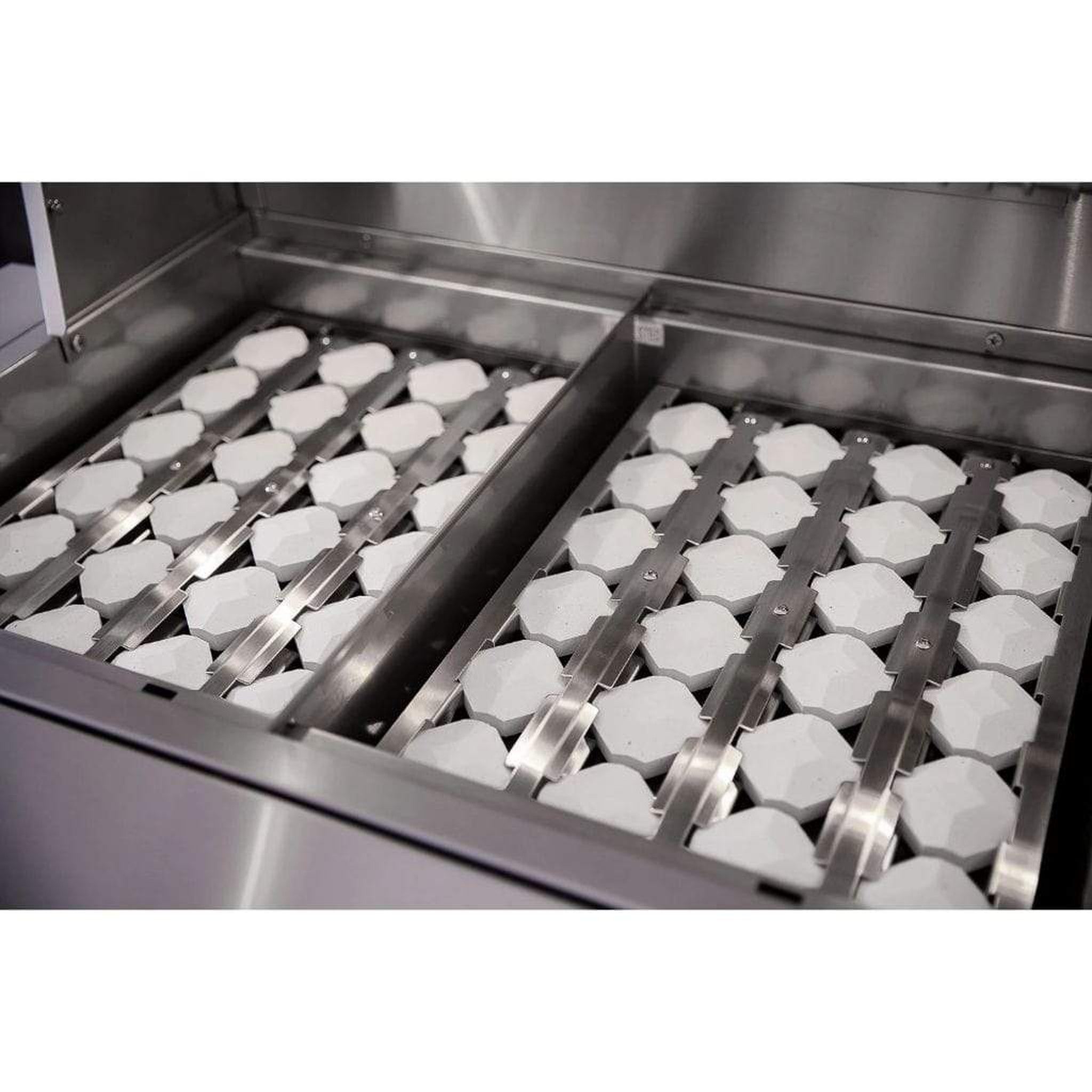 - Captured Briquette Trays: Unique ceramic briquettes sit above the burner to provide radiant heat and eliminate hot/cold zones across the 1,100in² cooking surface