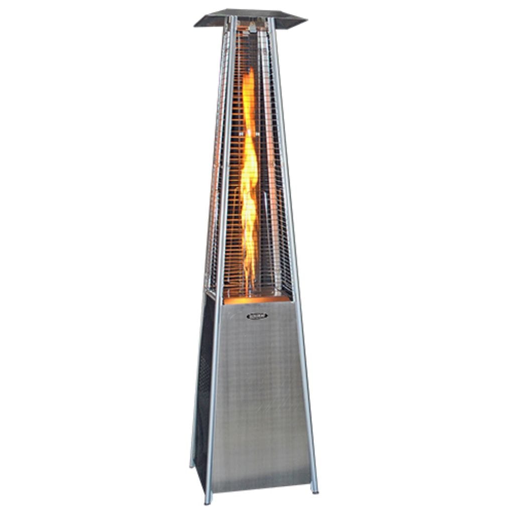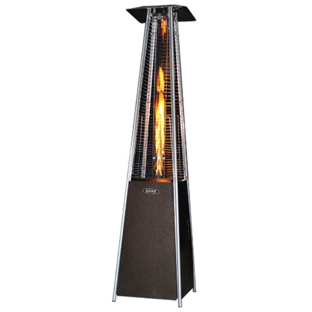 The Original SUNHEAT restaurant quality patio heater in stainless steel and golden hammered finish features a contemporary square design and a decorative variable flame to heat up any outdoor gathering. The unique pyramid shape provides functionality and style that will warm and accentuate your patio or deck. The enchanting flame will safely light up the night as it dances inside a four feet tall glass tube.