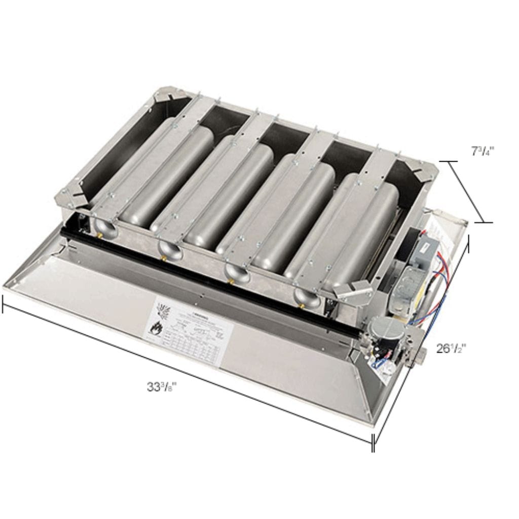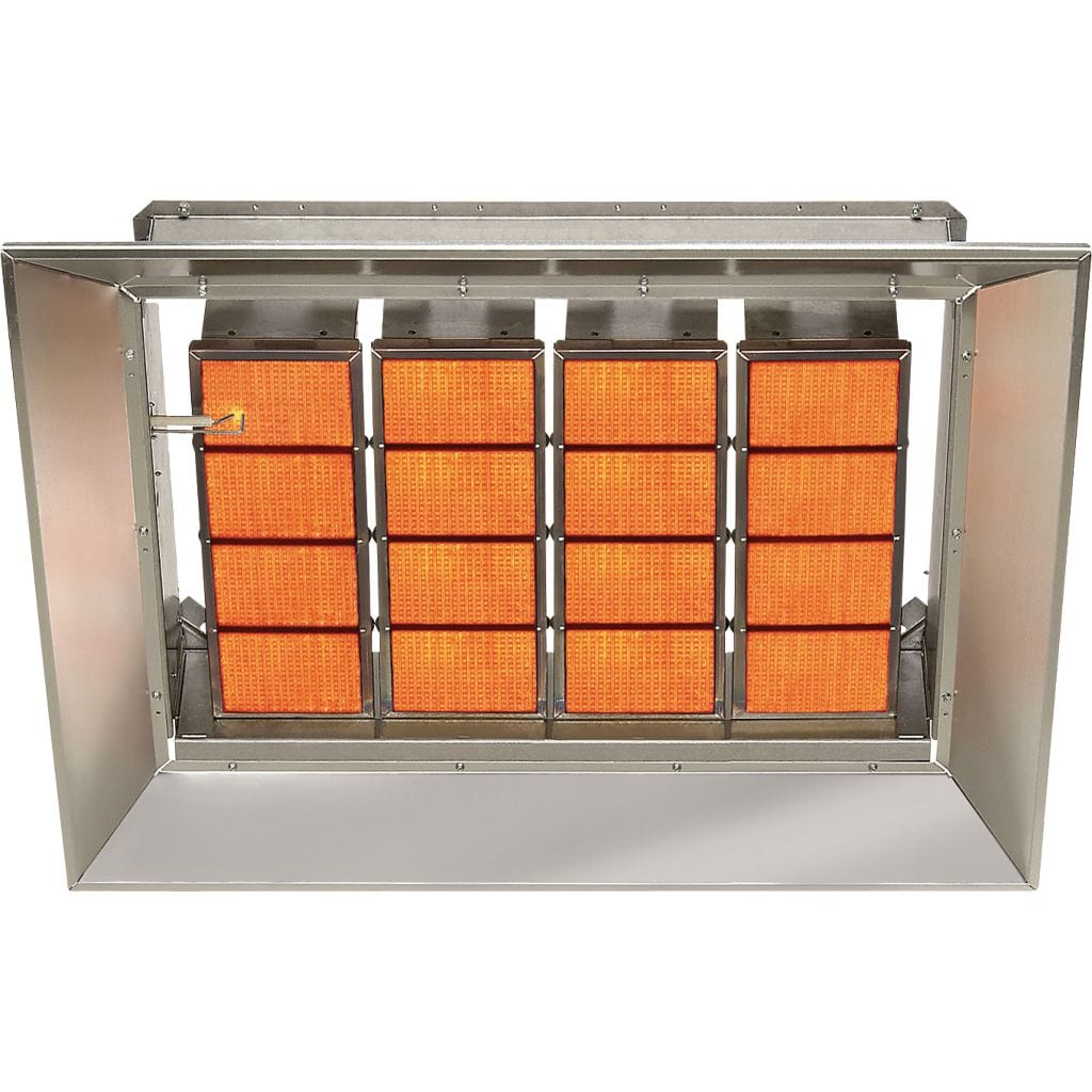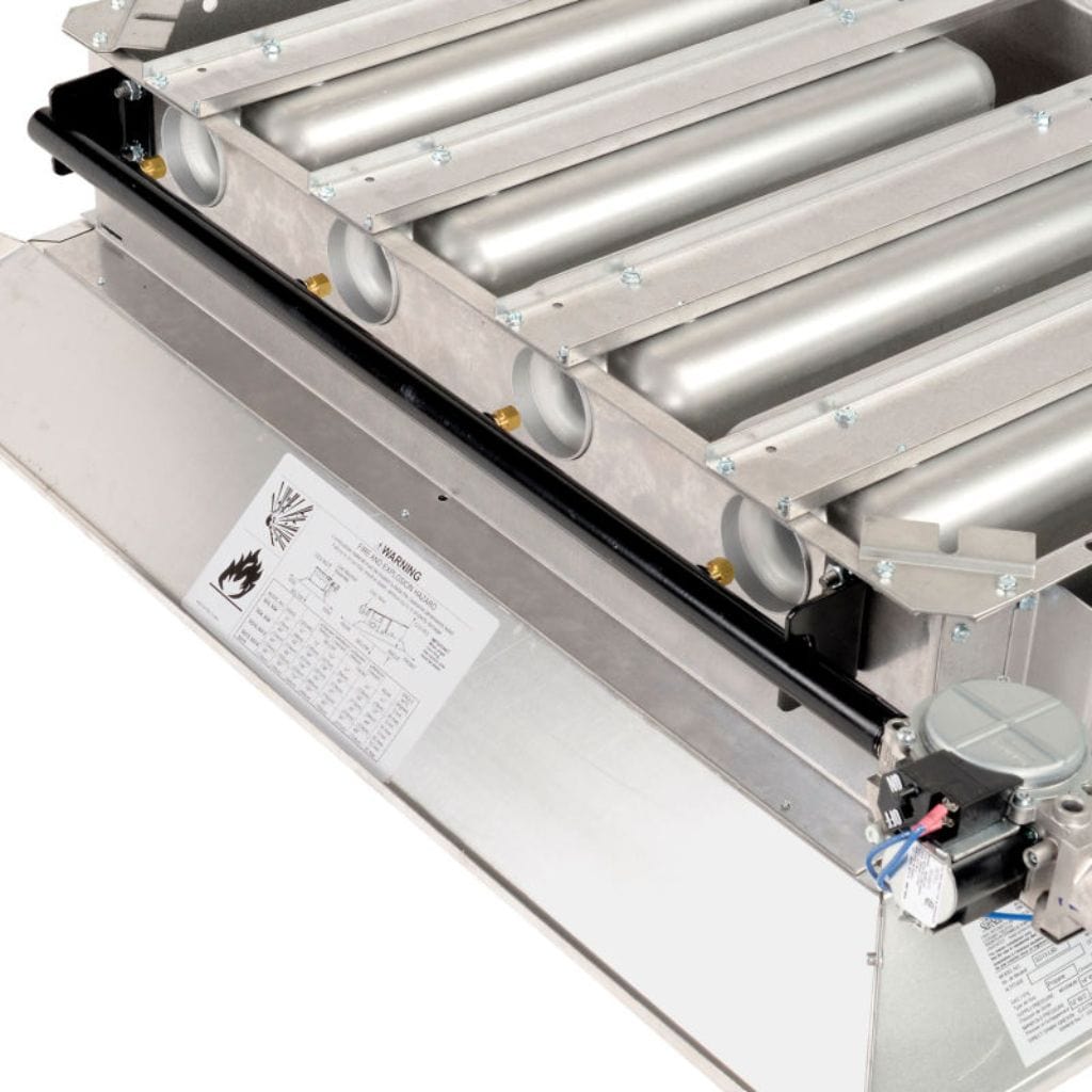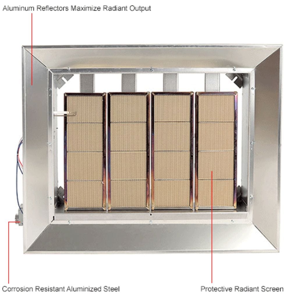 Ideal for spot heating large areas. Dimpled tile assembly offers increased radiant efficiency. Made with corrosion resistant aluminized steel. Aluminum reflectors maximize radiant output. Millivolt Standing Pilot Heaters do not require electrical power and operate with 100% gas shut-off safety control. Allows horizontal or angle mounting. Includes protective radiant screen. CSA certified.