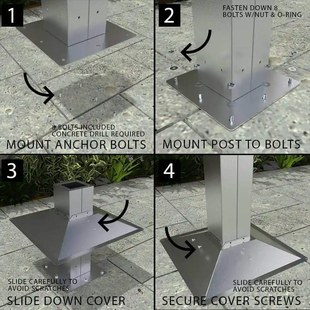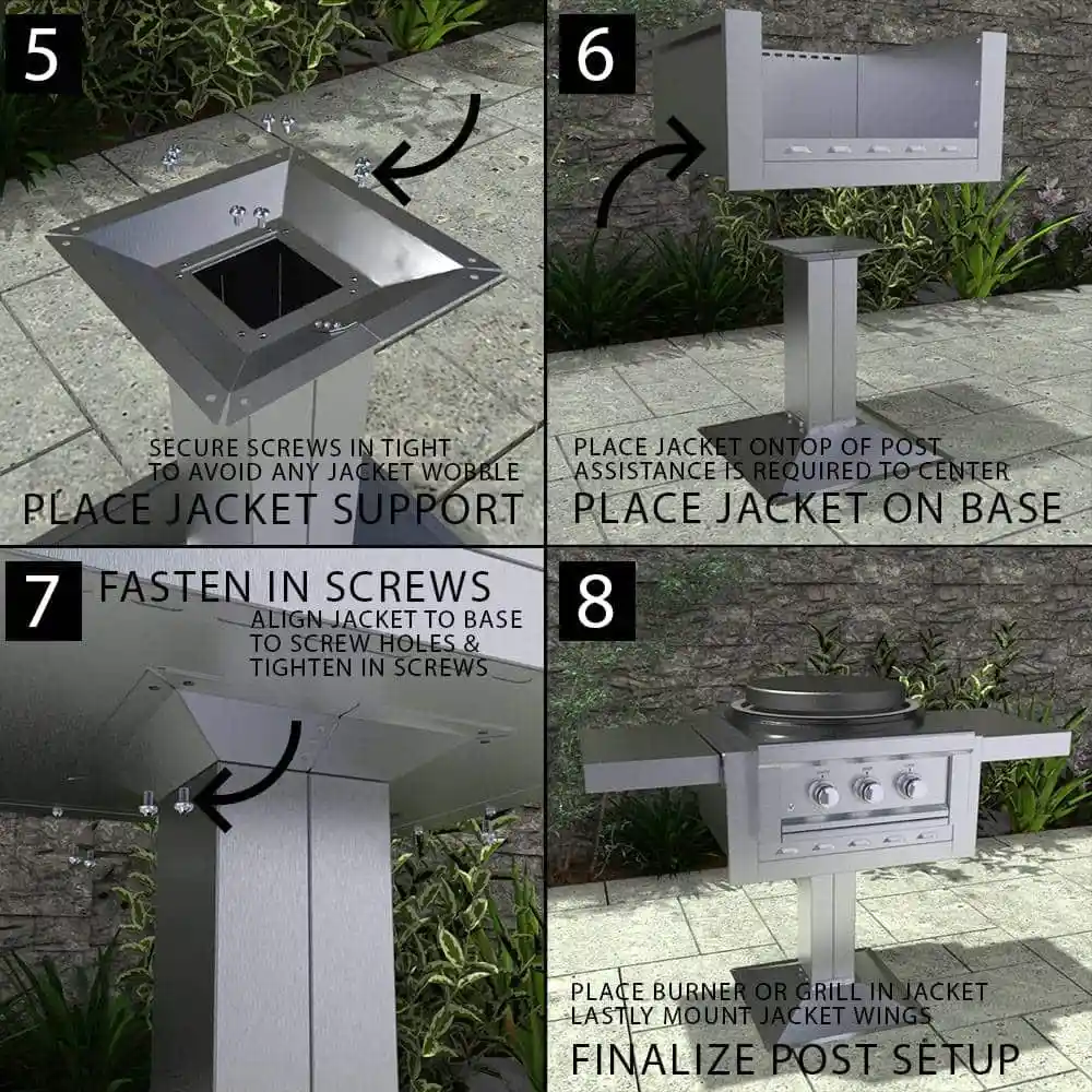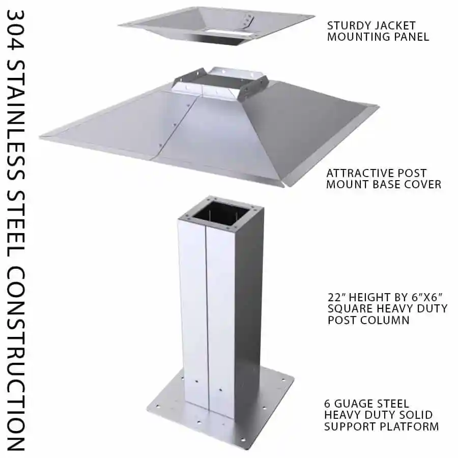 The 22 In. Sunstone Post Mount for the Appliance Jackets is uniquely designed to attach to all Sunstone Jacket Models right out of the box with minor assembly. The Post Mount is a safety essential when installing your Grill or Burner as a Stand-Alone grilling station for your patio, wood deck, or rooftop villa. This post-mount has a single heavy duty 6 In. by 6 In. post with a solid 6 Gauge thickness mounting base and in all 304 stainless steel. The Post Mount allows the jacket to function perfectly with optimal airflow with in/out vents in the lower front bottom edge and upper back edge which feature open vents allowing pass-through venting of all excess heat and dangerous gasses. Make your kitchen a snap with the complete Jacket, Wings & Post Mount package combined to allow your burner or grill to free-stand in a stationary position as a Post-Mount Burner or Grill of your choice.