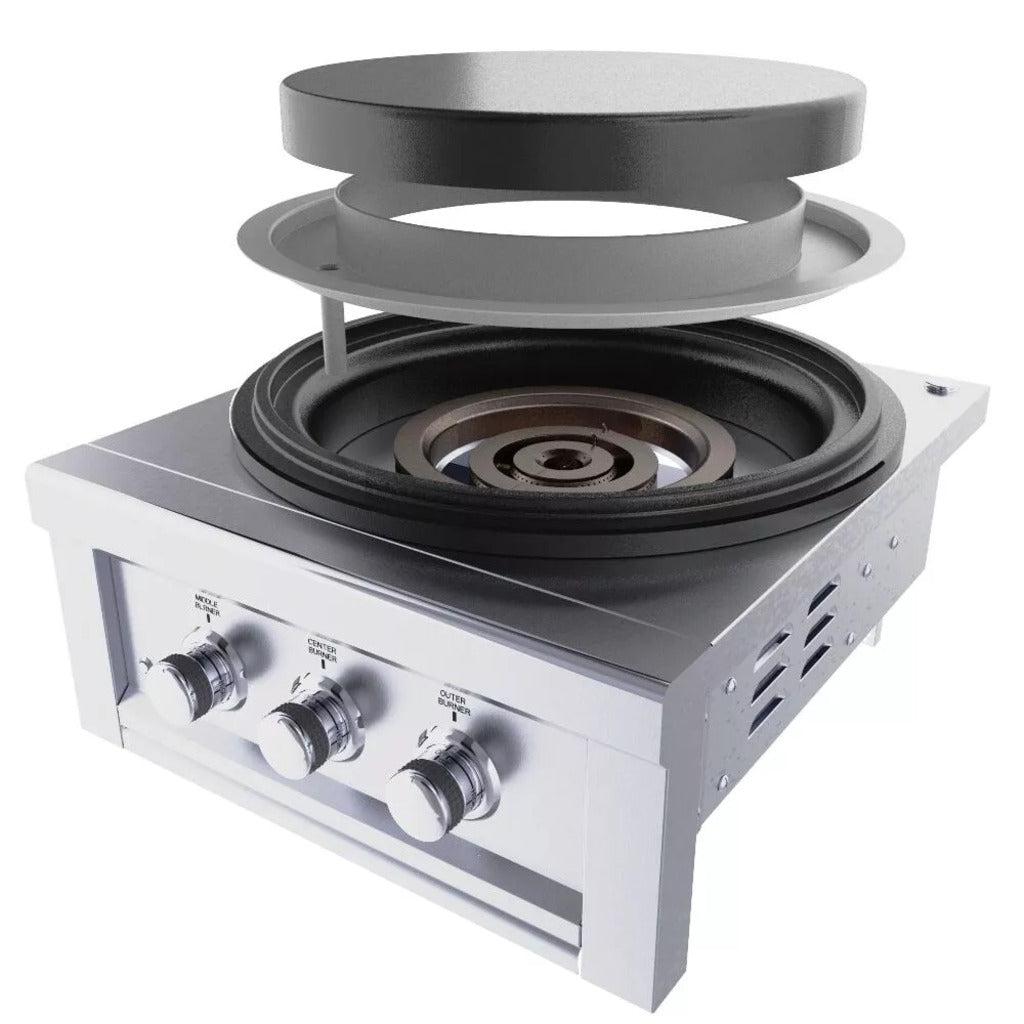 Sunstone® Series 24″ Power Cirque™ Solid Steel Griddle, features Three heavy-duty Cast-Iron Cirque™ burners totaling up to 65,000 BTU recessed into a Ceramic Heat Insulator making this the ONLY true circular power burner available in the market. Cooking on a Circular Cooktop provides an open experience for your outdoor living space. The circular cooktop gives you ease of use and serving to your family and since essentially all cooking accessories are round this provides a perfectly balanced heat distribution for your Stock Pots or Cooking Pans. Accenting this burner is the impressive LED lighting enabling you to use your burner in the late evening hours, and never miss a beat while you’re grilling it up for the whole family in any way you wish – the Power Cirque Burner has you covered.