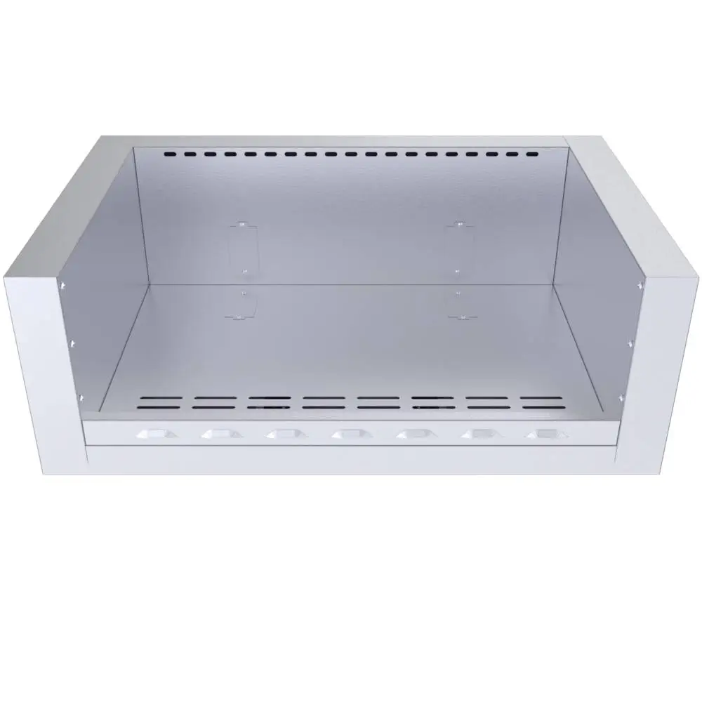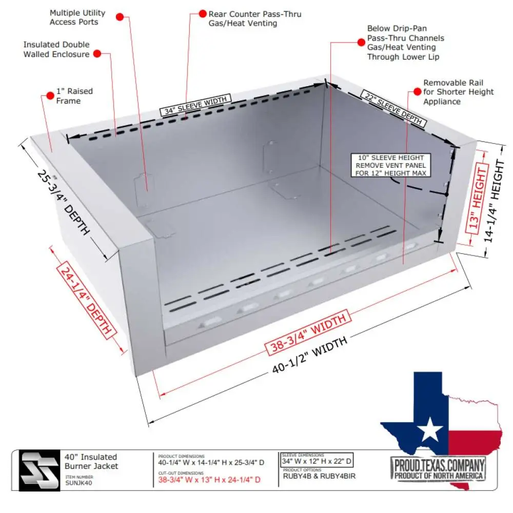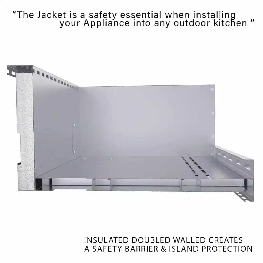 The Sunstone Universal Appliance Jacket is uniquely designed to receive multiple Burner Brand Models right out of the box with minor assembly. The jacket is a safety essential when installing your burner into any outdoor kitchen or BBQ island enclosure ensuring you have an adequate heat barrier and proper venting. This jacket has double-walled construction in all 304 stainless steel with a sturdy self-supporting raised ledge around the sides and back that adds one more layer of quality to your outdoor kitchen. The Sunstone Jacket is made for perfect airflow with in/out vent in the lower front bottom edge and upper back edge which features open vents allowing pass-through venting of all excess heat and dangerous gasses. It has a universal design with covered utility ports on either side depending on which side your appliance gas or electrical is connected, you only need to open the specific ports you are using, and others stay covered for safety