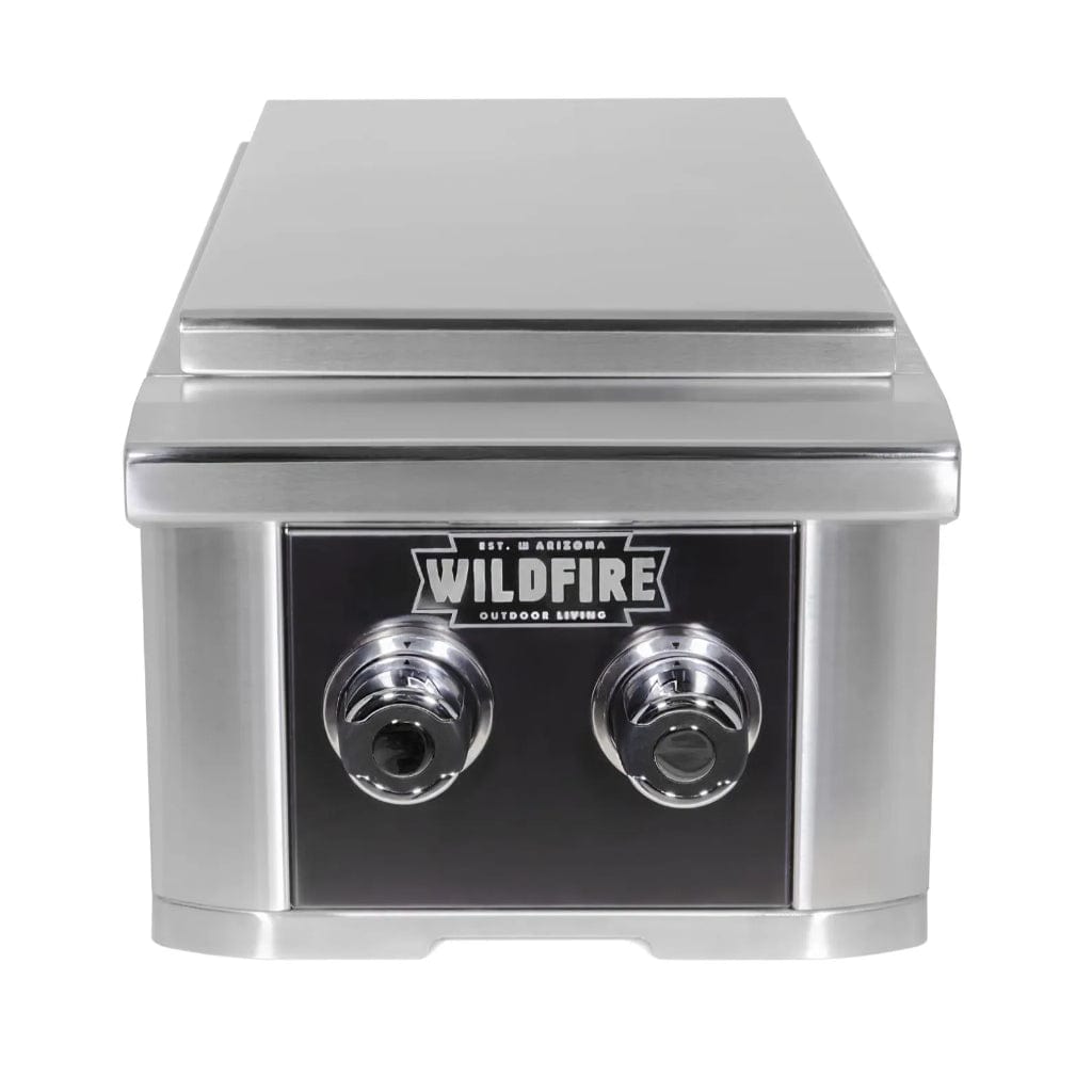 The Wildfire - Black Double Side Burner lets you cook two delicious meals at once. Perfect for preparing side dishes, like vegetables, pasta, potatoes, & more. It features a built-in design and two heavy-duty, cast brass burners that deliver up to 30,000 BTUs of heat, while LED backlit knobs illuminate the area around it.