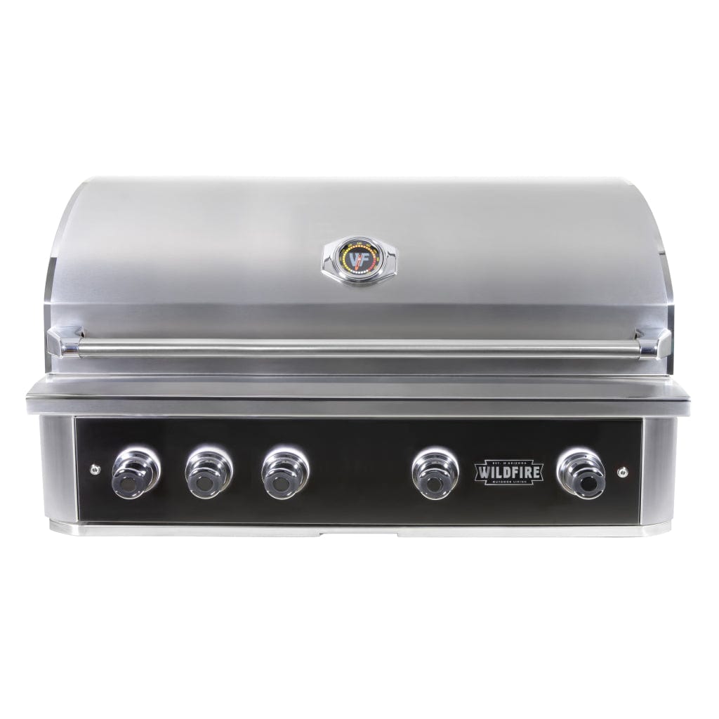Designed to be a sleek and modern addition to the backyard, The Wildfire Ranch Pro Built-In Gas Grill – 42" is integrated into any custom outdoor kitchen, a modern style that stands up to harsh weather. A seamlessly welded lid, rounded edges, and luxury oversized handles add a comfortable feel, while internal lighting and LED knob bezels illuminate your cooking station.